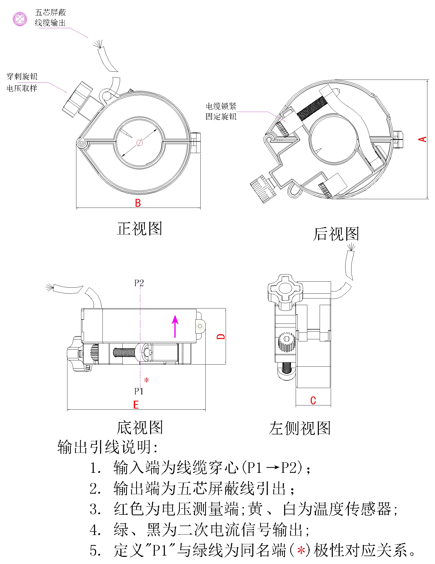 TR-D系列开合式户外防水穿刺取电测温电流互感器,具有电流测量,穿刺针电压取电,线缆温度采集的功能。集约化一体式设计,开合结构,安装方便。推荐一次额定电流50A~600A,二次输出为五芯屏蔽线引出。输出信号为二次电流、一次电压以及线缆温度,有效提供线路实时信息。拥有良好的线性,可以实现多个传感器的功能,广泛配套于多功能电力仪表。